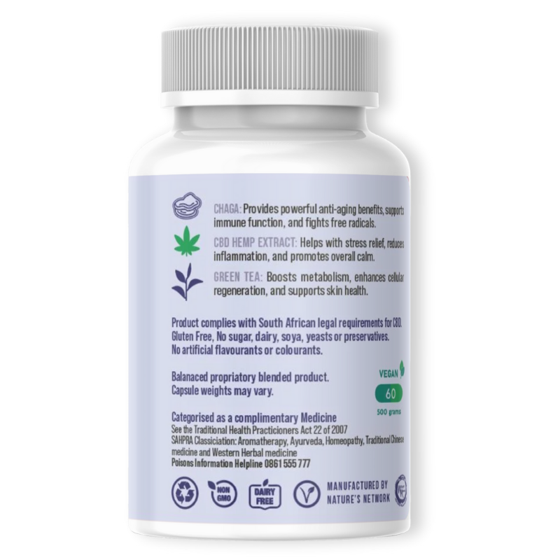 Embrace graceful aging with our CBD 3-in-1 Age Plus capsules (60 Vegan caps). This advanced formula blends Chaga for potent anti-aging benefits and robust immune function, CBD Hemp Extract to ease stress and cultivate overall calm, and Green Tea for powerful antioxidant action.