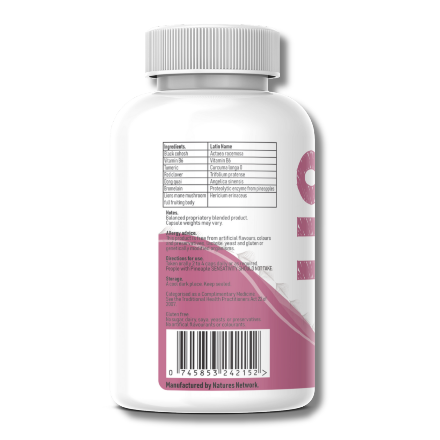 This carefully crafted blend features Black Cohosh, known for easing menopausal symptoms and enhancing sleep. Red Clover may reduce discomfort while supporting bone, skin, and heart health. Turmeric offers anti-inflammatory benefits, helping to calm joint pain. Further joint and bone support comes from Lion's Mane & Bromelain, potentially decreasing osteoporosis risk and easing stiffness. Dong Quai is included for its ability to soothe PMS and menopause discomfort. Finally, Vitamin B6 assists in lifting mood and managing stress.