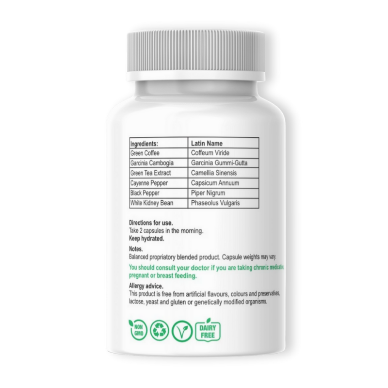 This expertly formulated supplement combines Green Coffee, Garcinia Cambogia, and Green Tea Extract to support metabolism and fat burning. Cayenne Pepper and Black Pepper enhance thermogenesis and nutrient absorption. Additionally, White Kidney Bean helps reduce carbohydrate absorption.